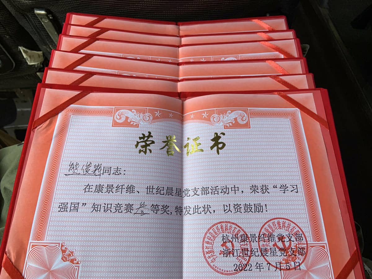 در 5 ژوئیه، شعبه حزب از شرکت فناوری فیبر ژجیانگ قرن مورنینگ استار و شعبه حزب فیبر هانگژو کانژینگ برای بازدید از مکان یادبود اردوگاه کار اجباری شانگرائو، محصول واقعه آنهویی جنوبی، به شانگرائو، استان جیانگشی رفتند. . در راه، یک مسابقه مشترک در مقیاس کوچک برای یادگیری دانش یک کشور قدرتمند در اتوبوس انجام شد. اعطای گواهینامه ها و پاداش های افتخاری با هدف تقویت دانش نظری و بهبود کیفیت اعضای حزب!